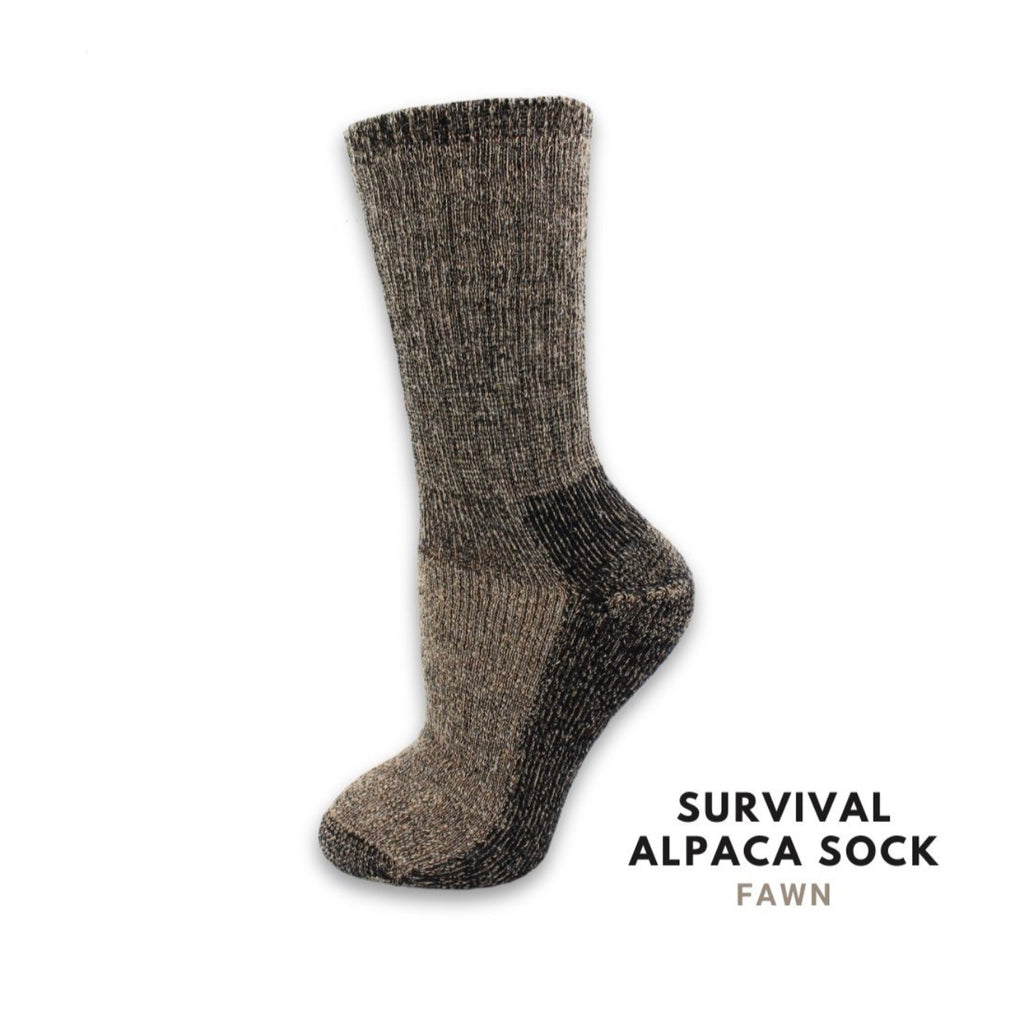 Our Survival Sock is a terry loop lined mid-weight sock designed for a wide range of outdoor activities and climates. The soft alpaca terry loops are combined with a durable nylon outer shell. Reinforced foot arch band and a ribbed knit ankle support ensure a proper fit every time. This warm and comfortable sock is our best selling style across the country! Hypo-allergenic, un-dyed, and odor resistant.